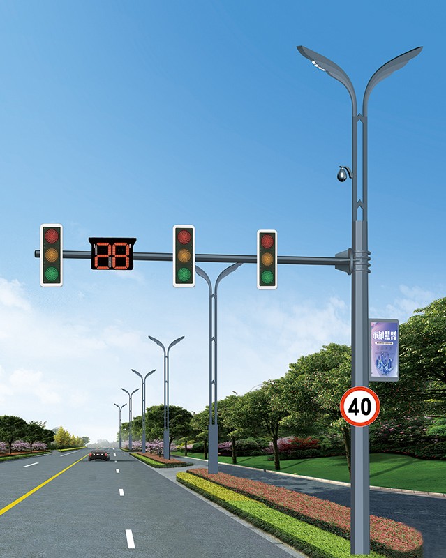 桿件規格: 1.立桿高度:立柱8-10米,橫臂3-15米。厚度6-12mm 2.桿件材質:優質Q235鋼材,表面熱鍍鋅,可選擇噴塑處理 3.配套標志牌、信號燈、監控設備、道路照明 4.造型:F型2F型、3F型、T型 5.質保:10年